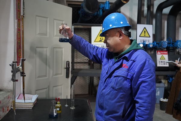 在水化A車間,劉丁一穿上工作服,戴上防護(hù)用具,立刻進(jìn)入工作狀態(tài)?;?yàn)工作枯燥乏味,但對質(zhì)量的要求卻精益求精,從接樣到測量再到數(shù)據(jù)分析,他嫻熟地倒著試劑、觀察著試劑瓶,一支燒瓶、一些水、幾滴試劑,隨著劉丁一搖晃的燒瓶,漸漸的,瓶子中的水從紫紅色,變成了淺藍(lán)色。為了檢驗(yàn)軟化水的質(zhì)量是否達(dá)標(biāo),確保鍋爐一次網(wǎng)用水安全,這一天他要對水質(zhì)至少進(jìn)行8次檢驗(yàn)。