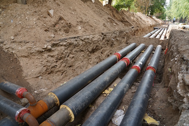 在開(kāi)天花園小區(qū)熱力站供熱管線出口區(qū)域,兩名工人師傅正在清理現(xiàn)場(chǎng)的供熱管線。現(xiàn)場(chǎng)看到管溝內(nèi)鋪設(shè)的主管線、與樓宇的抽頭安裝已全部完工,溝內(nèi)自來(lái)水管線、污水管線、弱電管線、強(qiáng)電管線縱橫交錯(cuò)。