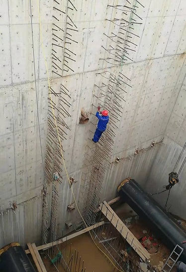 7月28日上午,遠(yuǎn)遠(yuǎn)就看到一名施工人員正沿著沉井壁上的幾根鋼筋小心翼翼地下到沉井底部,筆者看的是膽戰(zhàn)心驚,沉井底部有兩名焊工正在焊接管線接口。