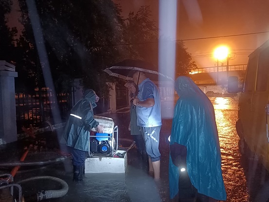 橋靠分公司組織員工們先將防汛沙袋置于地勢(shì)較低的單元門口,將水泵置于地勢(shì)最低處做好了防汛排水的準(zhǔn)備工作。為了確保人民群眾的生命財(cái)產(chǎn)安全,在做好前期準(zhǔn)備工作后,大家便守在現(xiàn)場(chǎng),密切關(guān)注天氣情況,實(shí)時(shí)監(jiān)測(cè)雨情汛情,雖然白天的天空還能看到藍(lán)天白云,但他們堅(jiān)守崗位絲毫不敢松懈,只是買了盒飯靠在車旁簡(jiǎn)單的解決了溫飽。13日夜間22時(shí),隨著雨量的加大及降雨的持續(xù),小區(qū)內(nèi)地勢(shì)低洼處排水量開始小于降水量,積水深度開始上漲。此時(shí)天空就像是開啟了“水簾洞”模式,穿著雨衣依舊全身濕透的防汛職工們冒著雨淌著水一遍遍的查看,按照防汛作業(yè)預(yù)案開展工作,他們始終堅(jiān)守一線在暴雨中逆行,全力以赴守護(hù)轄區(qū)群眾安危。